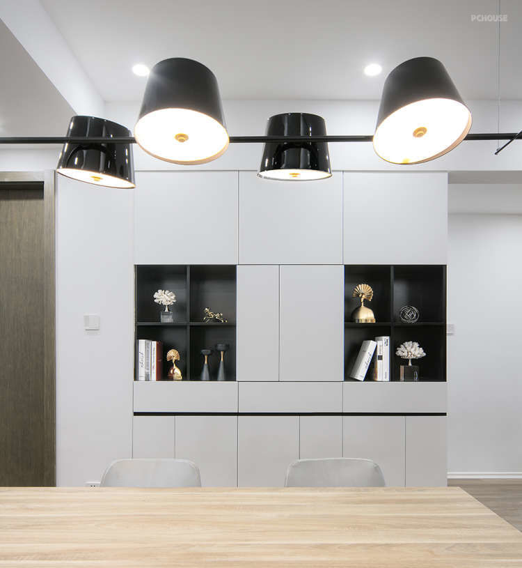 工作台背后整面墙的收纳柜,除了放书籍、文件,更避免卫生间门直通入户门的尴尬,柜门抽屉无拉手设计更具整体性。