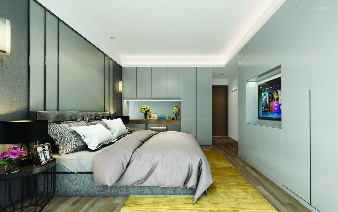 主卧背景墙利用规整线条构成对称,线条的使用偏硬朗,而床铺的柔软以及台灯、桌脚又完美地起到了中和作用。灰色丝质软包的床头显示业主的品质、格调,上好的床品与柔软的靠背为睡眠质量提供保障,温暖而不刺眼的木色地板、地毯显得格外温婉,为睡眠增添了一份舒适自然。我们将电视、化妆台设计成嵌入式,使整个空间凹凸有致,不至于过于沉重。