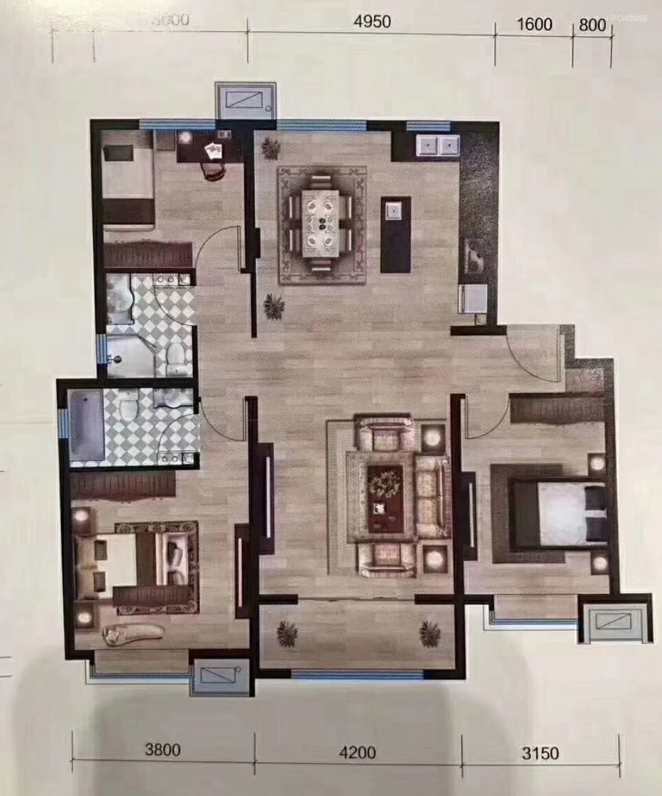 原始户型图,存在几点不足:厨房小,餐厅餐桌难以摆放 ,采光不足,因此我们着重针对这几点进行设计。