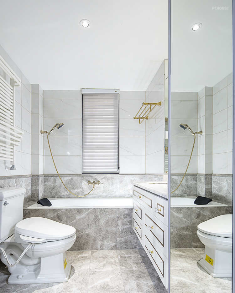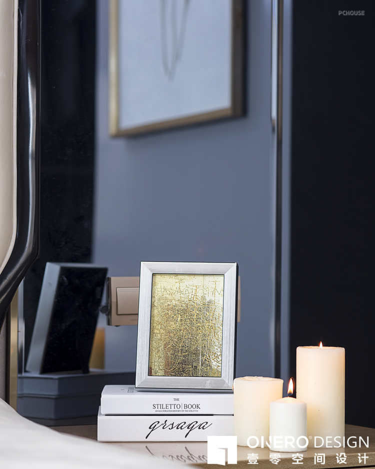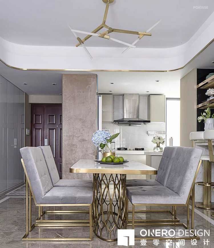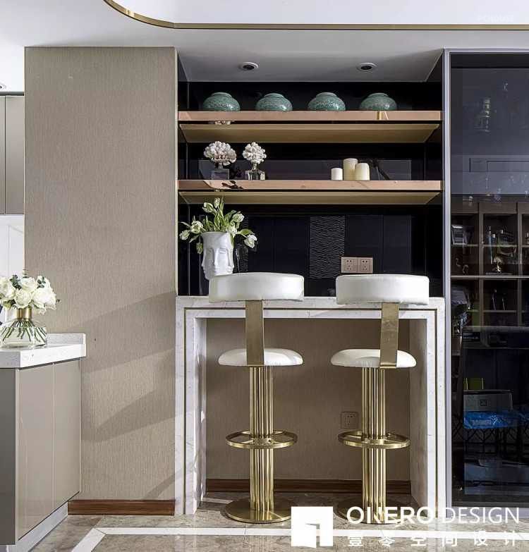 吧台处大理石与镜子的使用,运用虚实结合的手法产生视觉的延伸感。与吧台连为一体的玻璃柜,可储存男主人的珍藏酒品、也起到餐边柜的重要作用。