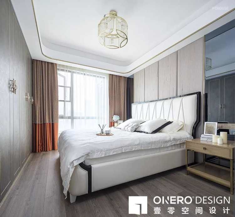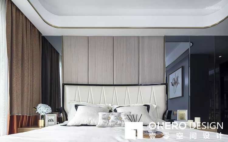 主卧在材质上与公共区域保持一致的延续,色调上又区别于公共区域的彩色、运用咖、灰、金等来营造出更宁静的休息空间。
