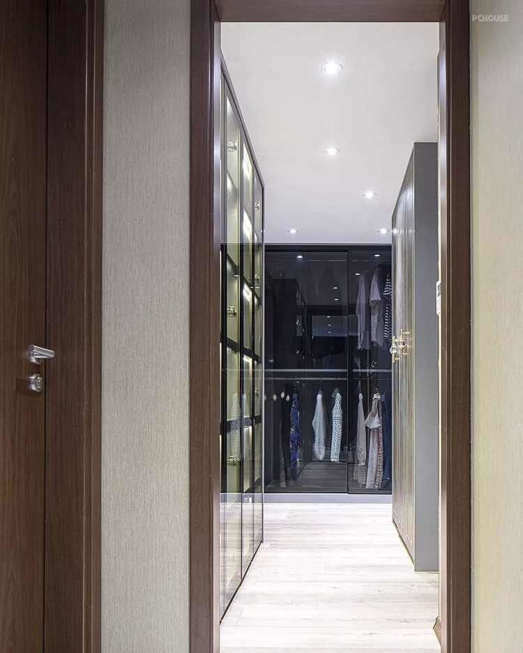 在过道和床之间设计的衣柜来规整动线走向,并营造出步入衣帽间的区域感来,最大化的利用了空间,并很好的进行了功能分区。