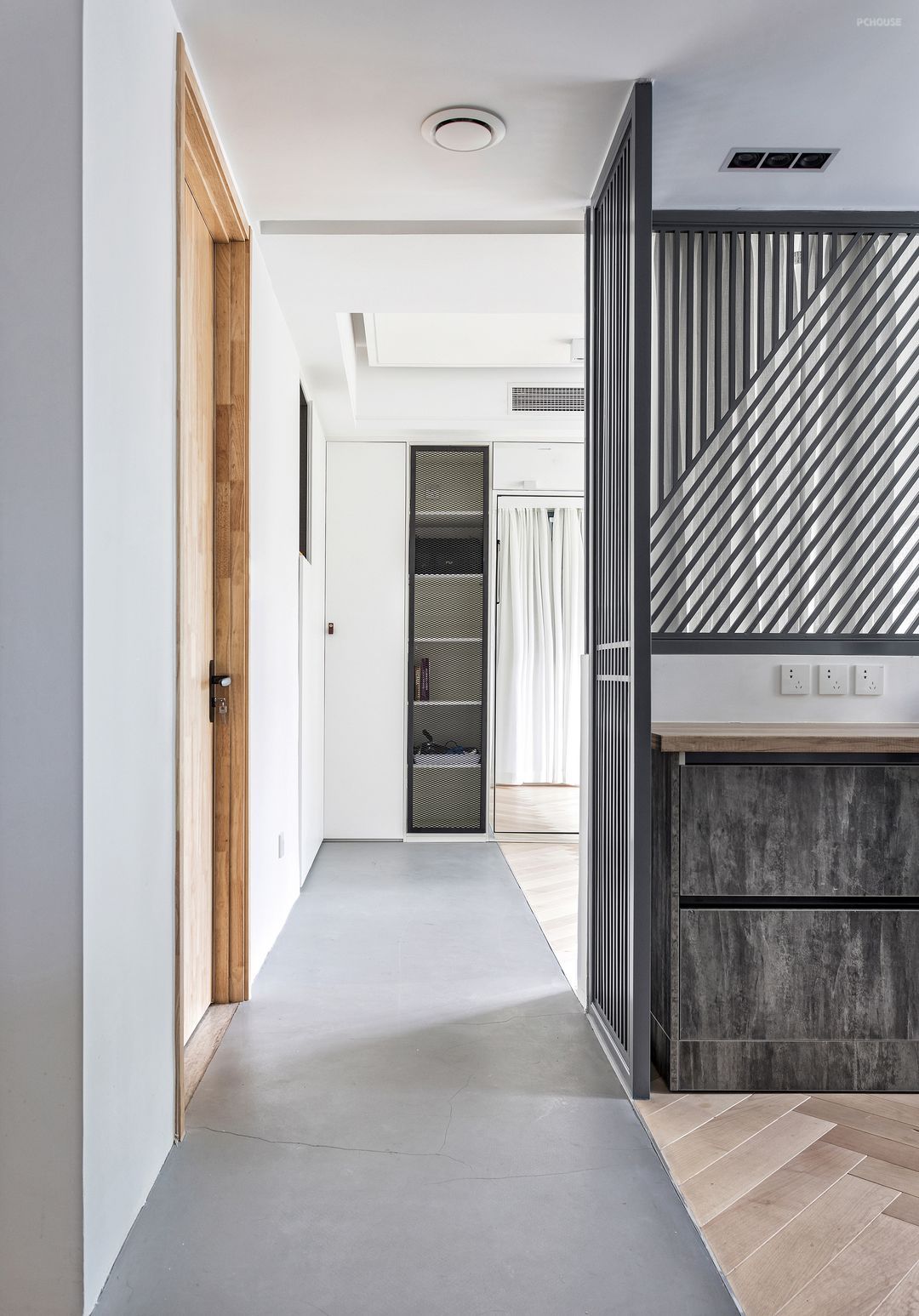 结构感很强的一个角度,木格扇、高木门、铁艺柜门、吊顶,地面材质碰撞,让多功能见层次丰富,材质多样性。多功能间里面的柜体也同样采用多种材质和功能,玻璃部分是Bu 布瑜伽健身时使用。门口配有暗藏轨道加以厚质地白色棉布帘,保证私密性