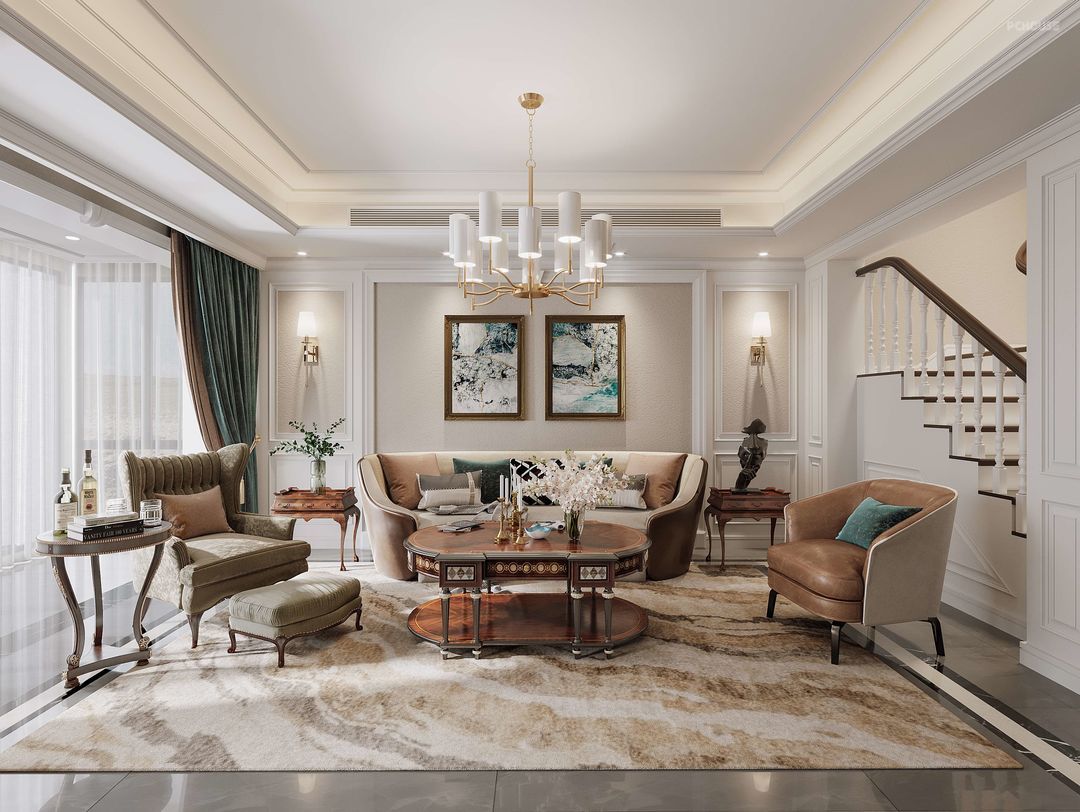 美式新古典风格是由美国的那种生活方式演变而来的,自由随意散漫,这就是美国人的一种生活状态。是时代发展趋势的产物,指的是色彩相对传统美式更加丰富,更加年轻化,家具选择更有包容性。其追求华丽、高雅的古典风格,居室色彩主调为白色。 家具为古典式家具、门、窗漆成白色。擅用各种花饰、丰富的木线变化、富丽的窗帘帷幄是西式传统室内装饰的固定模式,空间环境多表现出华美、富丽、浪漫的气氛。