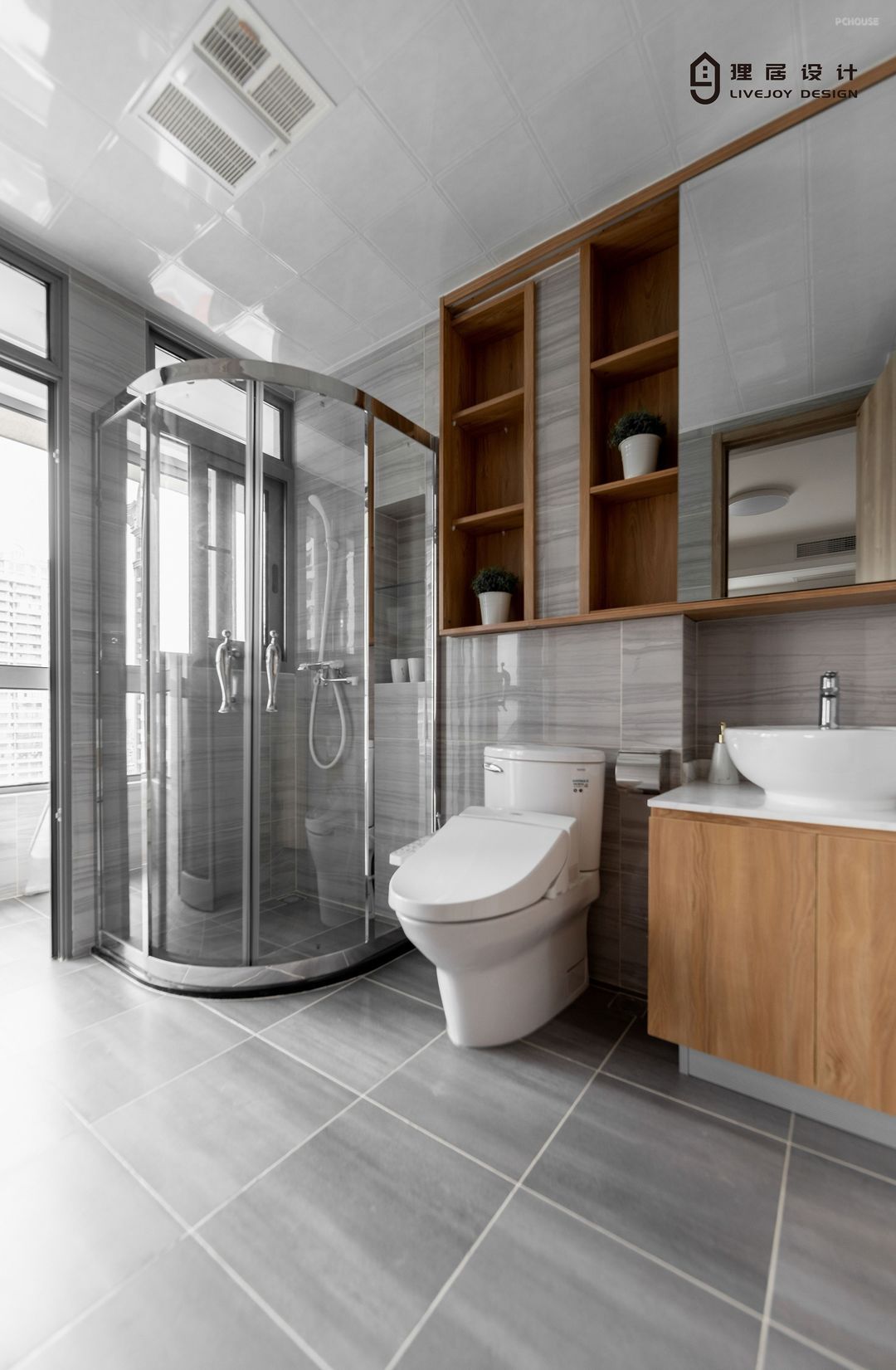 主卫,石膏板吊顶,一体化显平整美观。壁挂马桶上方水箱暗藏空间利用起来做了个木壁龛。