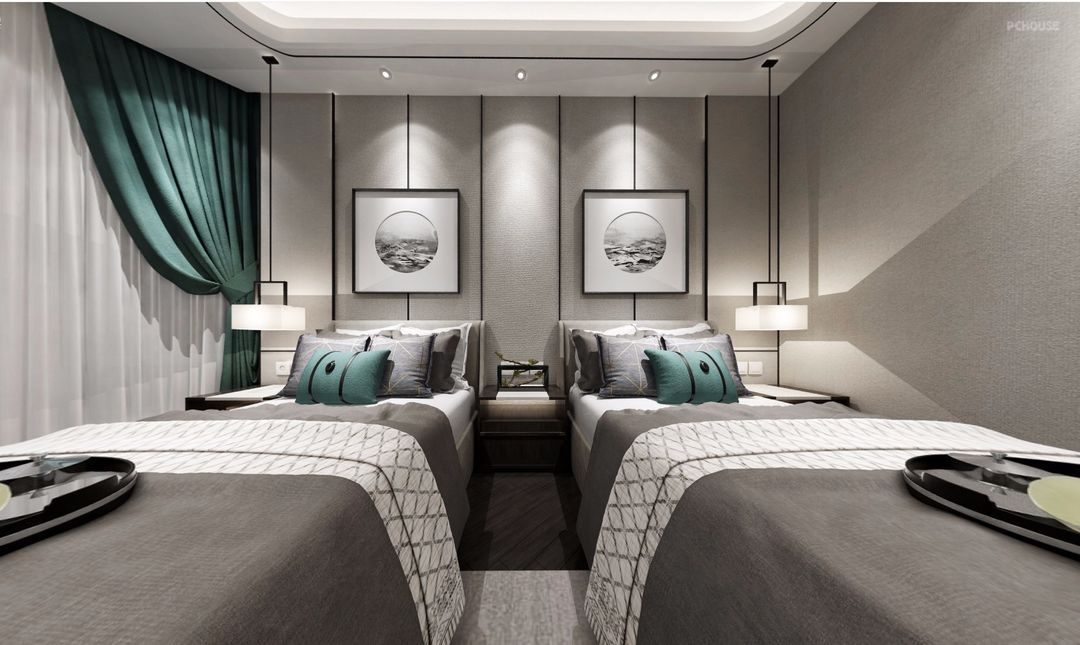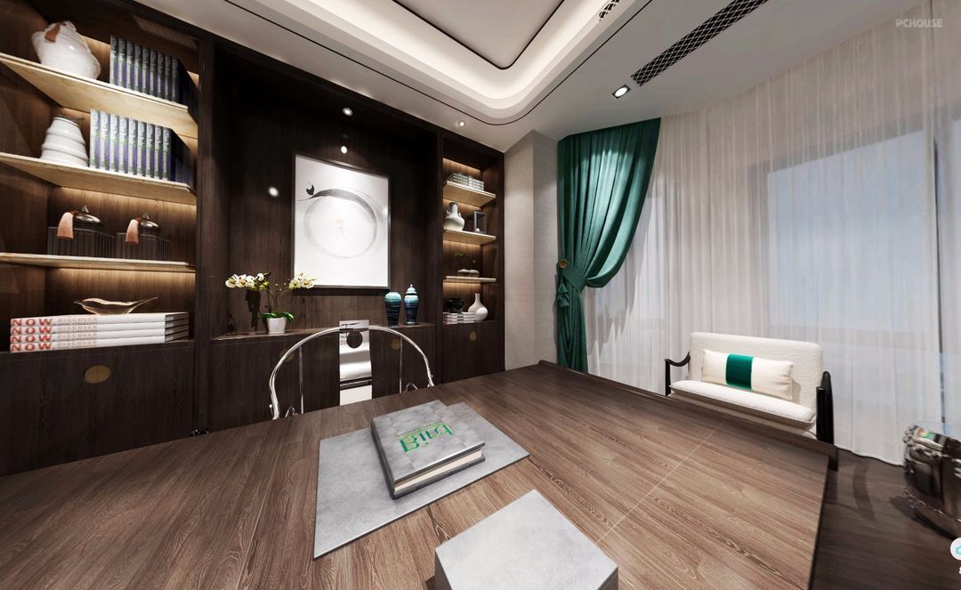 现代中式,中式情调中,现代优雅与之共生共融,褐色与灰白色组合,细腻的布艺与原木材料搭配,内敛雅致,亦古亦今。在整体的中性色调中,点缀的些许墨绿给空间带来丝丝鲜活气韵。