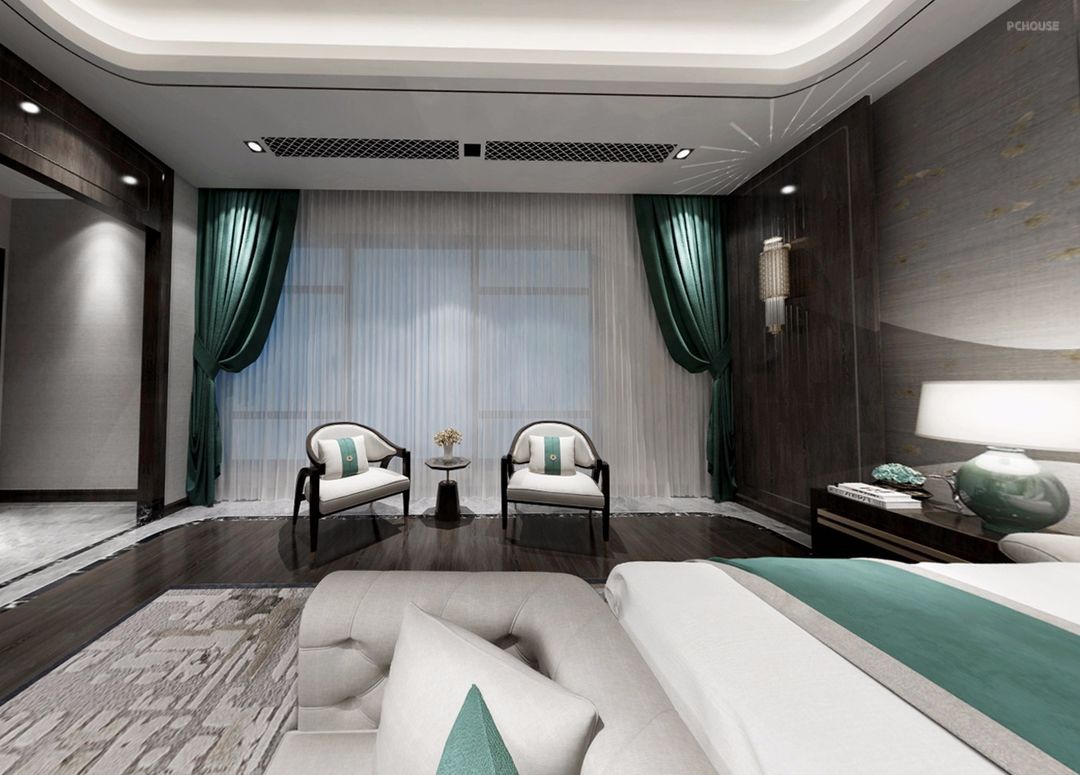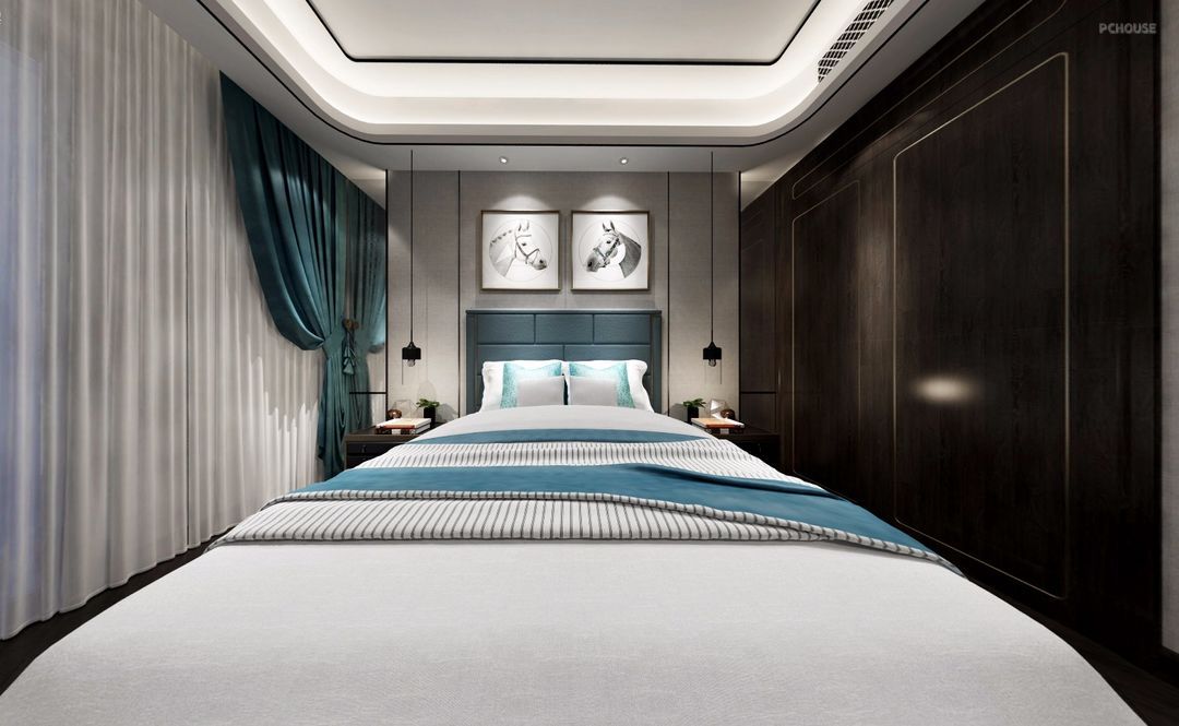 主卧在色彩方面秉承了传统古典风格的典雅和华贵,在配饰的选择方面更为简洁,更加流畅地表达出传统文化中的精髓。