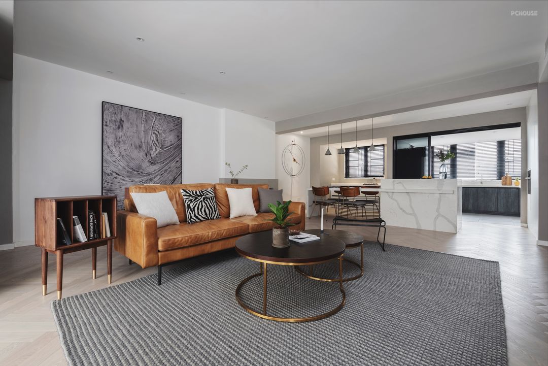 半开放式厨房透过移动玻璃门与客餐厅联系在一起