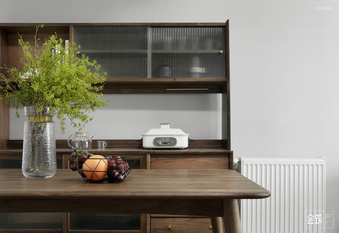 半通透的长虹玻璃作为隔断,在界定空间的同时,自带模糊的雾面又能让光线映入,胡桃木色的古朴和长虹玻璃的现代完美融合。