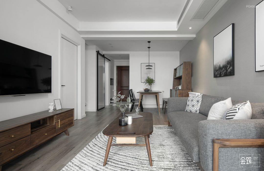 客厅与餐厅之间通过弱化梁体的吊顶设计达到区域分割的目的,两者相互融合,又各自独立。整体色调以灰、白、木为主,几幅装饰画弥补了墙面空间的简洁,增加了客餐厅区域的文艺气息。