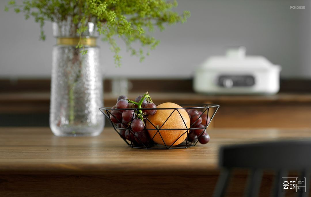在这个极简的北欧空间中,百搭低调的黑色铁艺果盘都极其简单又充满艺术感。