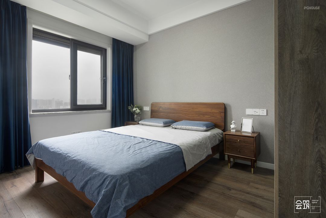 长辈房追求简洁、干净,延续了整体北欧风格的简约格调,静谧蓝的窗帘和床品搭配减少了原本空间的单调和呆板,清冽醉人充斥着空气感,给人带来安稳的感觉。