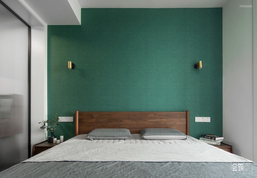 主卧室床头背景的墨绿色,是近年来很受欢迎的一种颜色,墨绿色搭配沉稳的胡桃木色,也比纯粹的绿色更加地时尚。木色的暖,绿色的冷,恰恰平衡了整个空间。