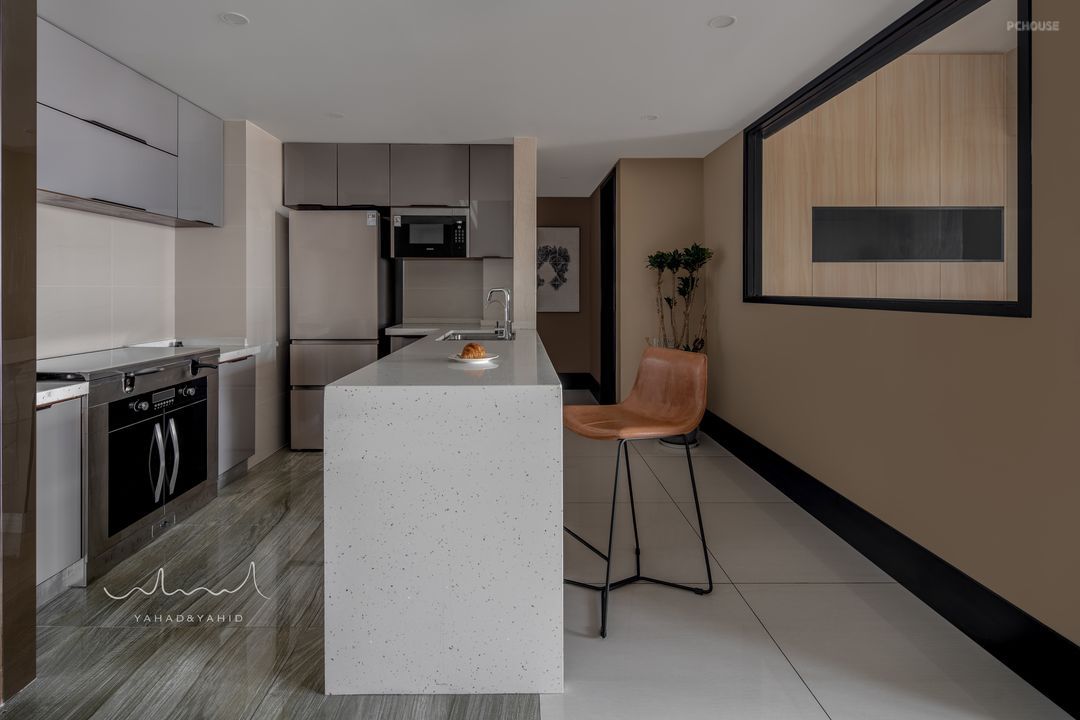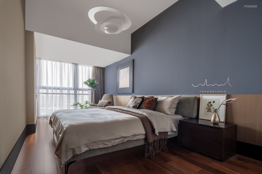 卧室的床也采用的是绒面材质,简单的搭配,整个空间都洋溢着现代感,生活中除了黑白,还有沉静低调的灰与棕,冷色调与暖色调的调和,为空间披上温暖静穆的轻纱