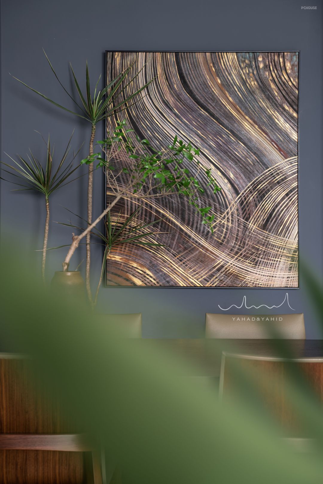 餐厅背后的挂画有着像木材一样的肌理,配合着餐桌的材质,一样具有生命力和自然的力量。千年木从角落里伸展它略带倔强的枝干,似乎在诉说着它不屈的故事。正如我们一样,从生活的滚轮和打磨下挣扎着想要在这个世间留下一抹绽放的痕迹