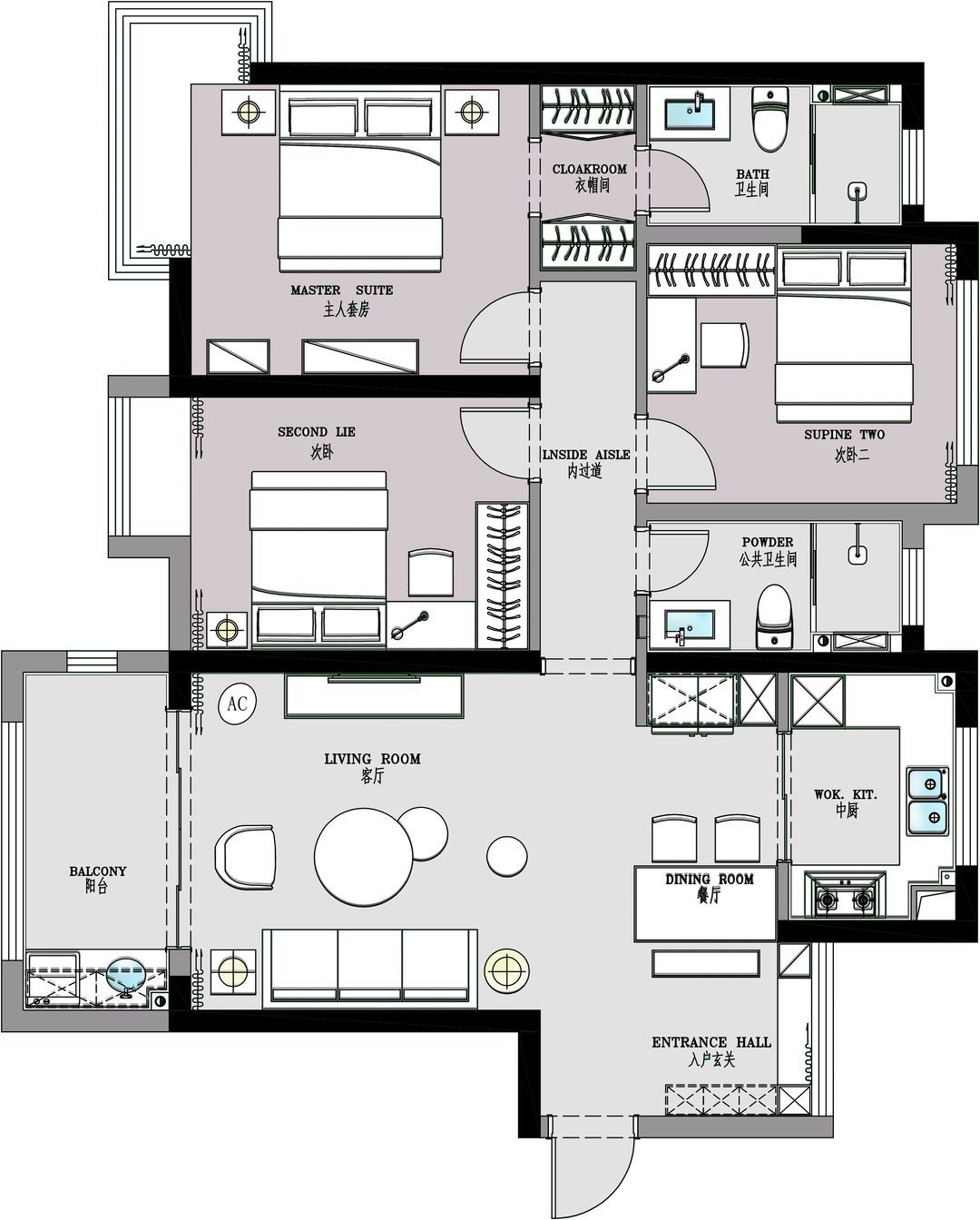 3.原始平面图一进门就可以看到主卧及卫生间的门,缺少私密性,通过我们的设计将主卧的门改到了左侧,不仅保护了户主的私密性,增大了主卧空间的利用,使主卧变成了一个套房,增加了动线的便利,还使空间的延伸感加强;