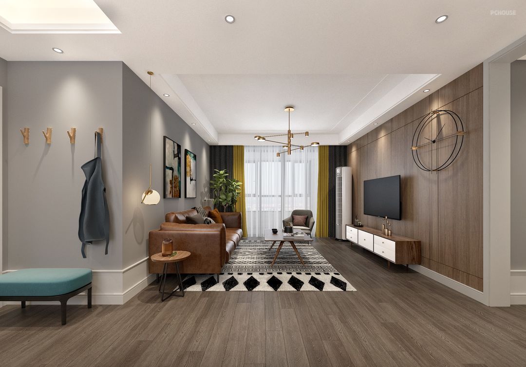 在设计上还是会有所偏重,突出生活的本质。简洁的线条,大方的配置,皮质的深黄色沙发搭配黑桃木的茶几,体验现代家居的时尚感。灰白偏黑的木地板彰显自然的格调,电视背景墙用了一整面的实木构造,点缀白色视觉面的电视柜,金色的轻奢摆件,金属感的时钟,不繁琐却个性十足。