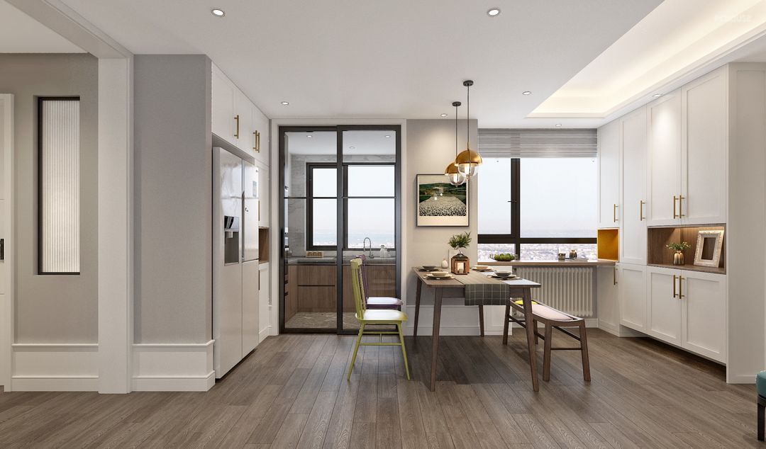 2.把原来的厨房,餐厅的位置重新调整,设计了嵌入式的大冰箱。通过空间的改动,厨房收纳空间变大;