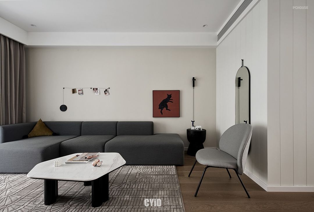 奶油黄色的背景墙配上深浅灰色的沙发与单椅,整个空间的静谧感油然而生。茶几、边几的颜色成为空间中平衡稳重的色调,小猫挂画的颜色比较明亮,让客厅整体不沉闷变得和谐又统一