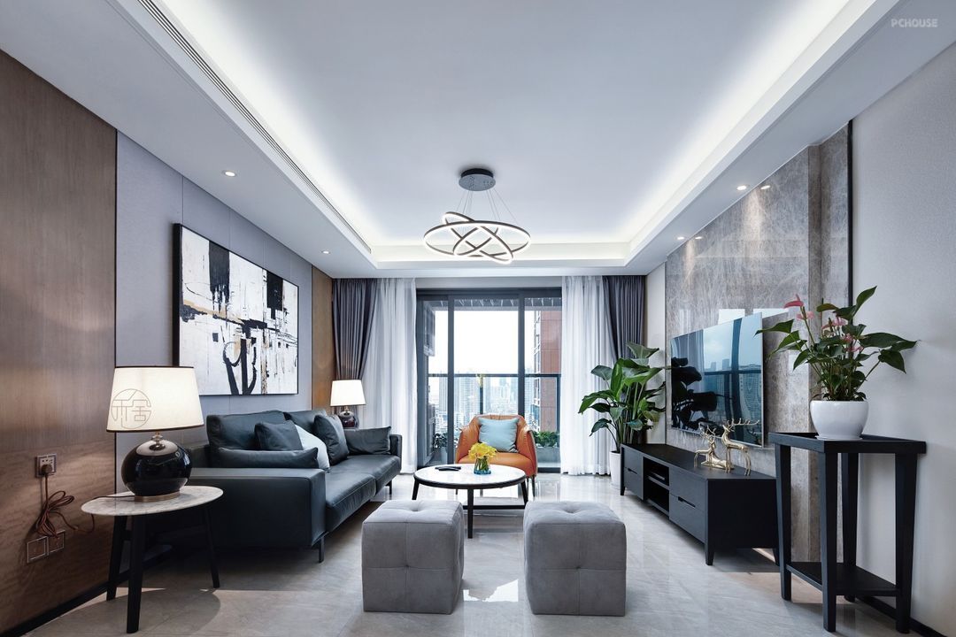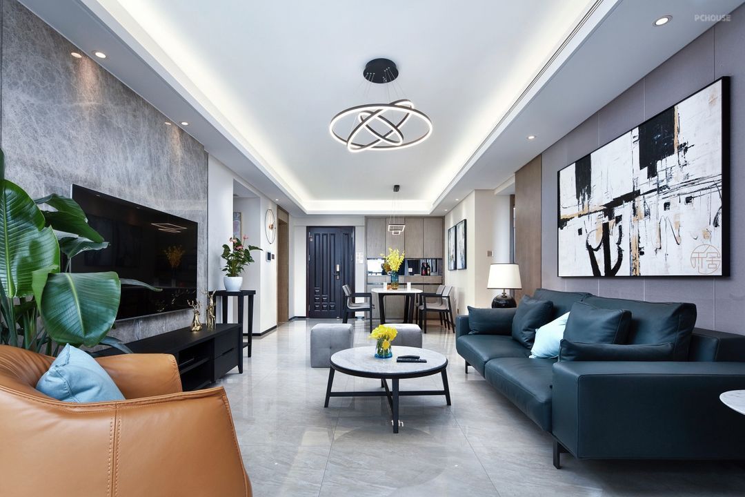 生活是需要仪式感,墙壁上一副好看的装饰画,与茶几上的黄色花束融合在一起,很有生活的气息,简单素雅的皮质家具,配上高级灰的窗帘,轻松营造出纯净的时尚与潮流相结合的轻奢感,几盆绿油油的盆栽,柔和了黑色的电视柜,让整个客厅色彩更加饱满丰富,显得更加精致。