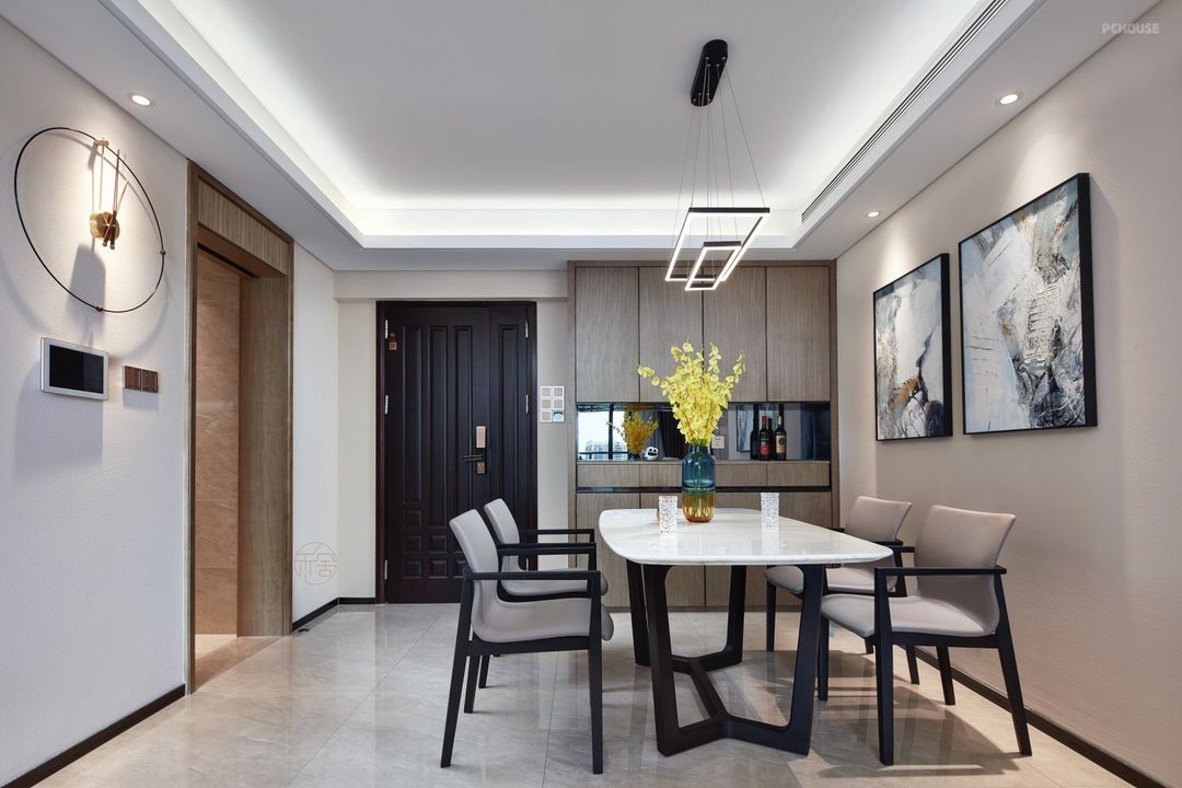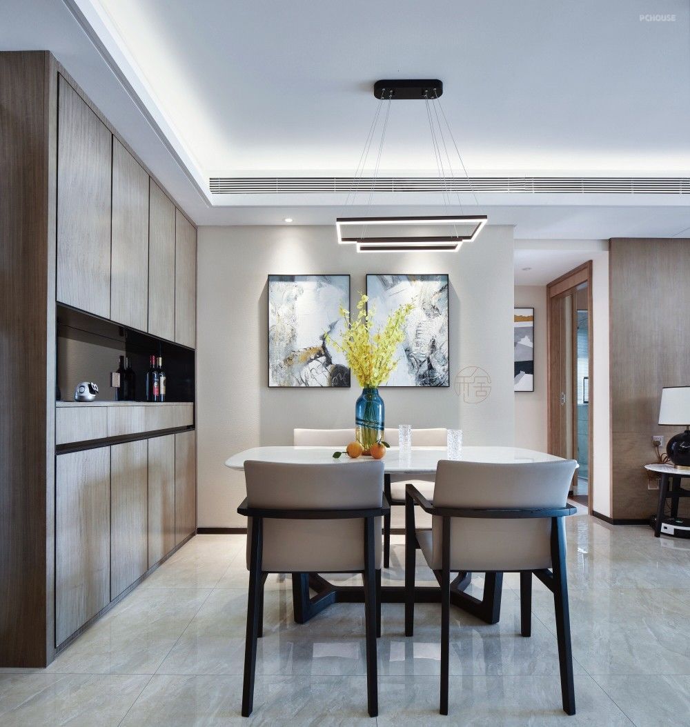 一束开得正艳的蝴蝶兰,点亮了整个餐厅,空气中弥漫着一阵阵花香,映着柜子里的几支红酒和墙壁上的两幅油画,可以想象得到,主人的生活过得很有诗情画意。