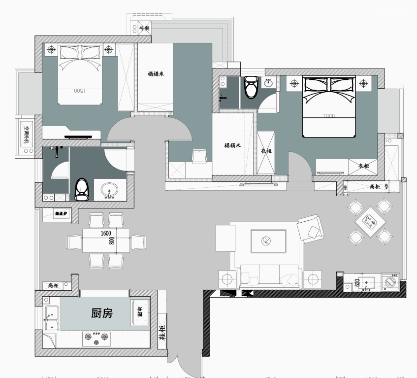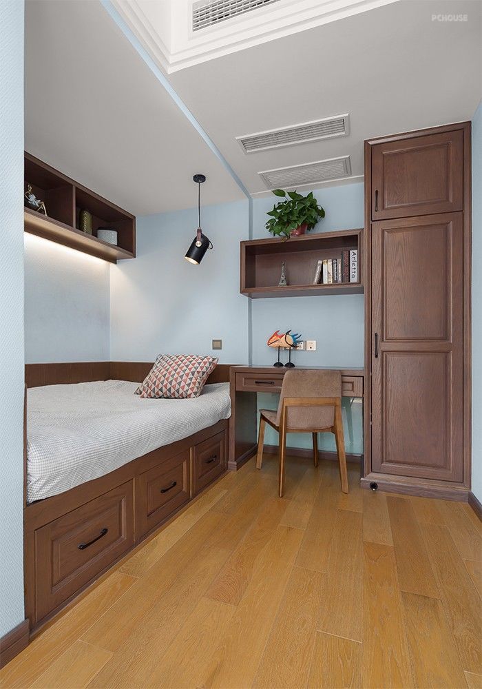 原始户型中的小孩房偏小,考虑到两个小男孩居住,所以将进入主卧室的门改至客厅电视墙的位置进入,把原有进卧室的过道和房间融为一体,扩大小孩房的空间,该房间设计了2张1.35米宽的具备储物功能的榻榻米,并各有单独的衣柜,空间运用非常合理。