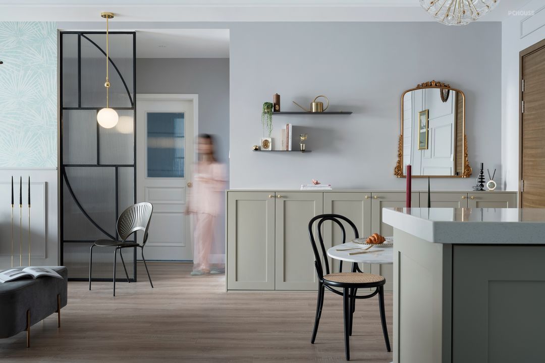 厨房改为开放式,吧台柜既能满足餐厅区域的储物,也成为了橱柜操作台面的延展,柜门保留奶油盐白茶色,与鞋柜呼应;厨房内部空间的橱柜则做成常规的优雅灰色,与客厅大色调呼应的同时也拉出了吧台柜前后的层次关系。