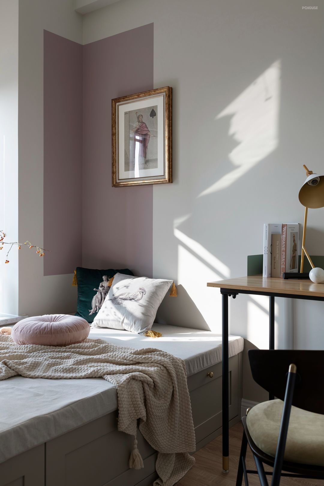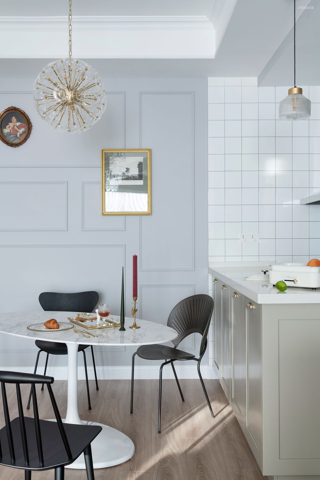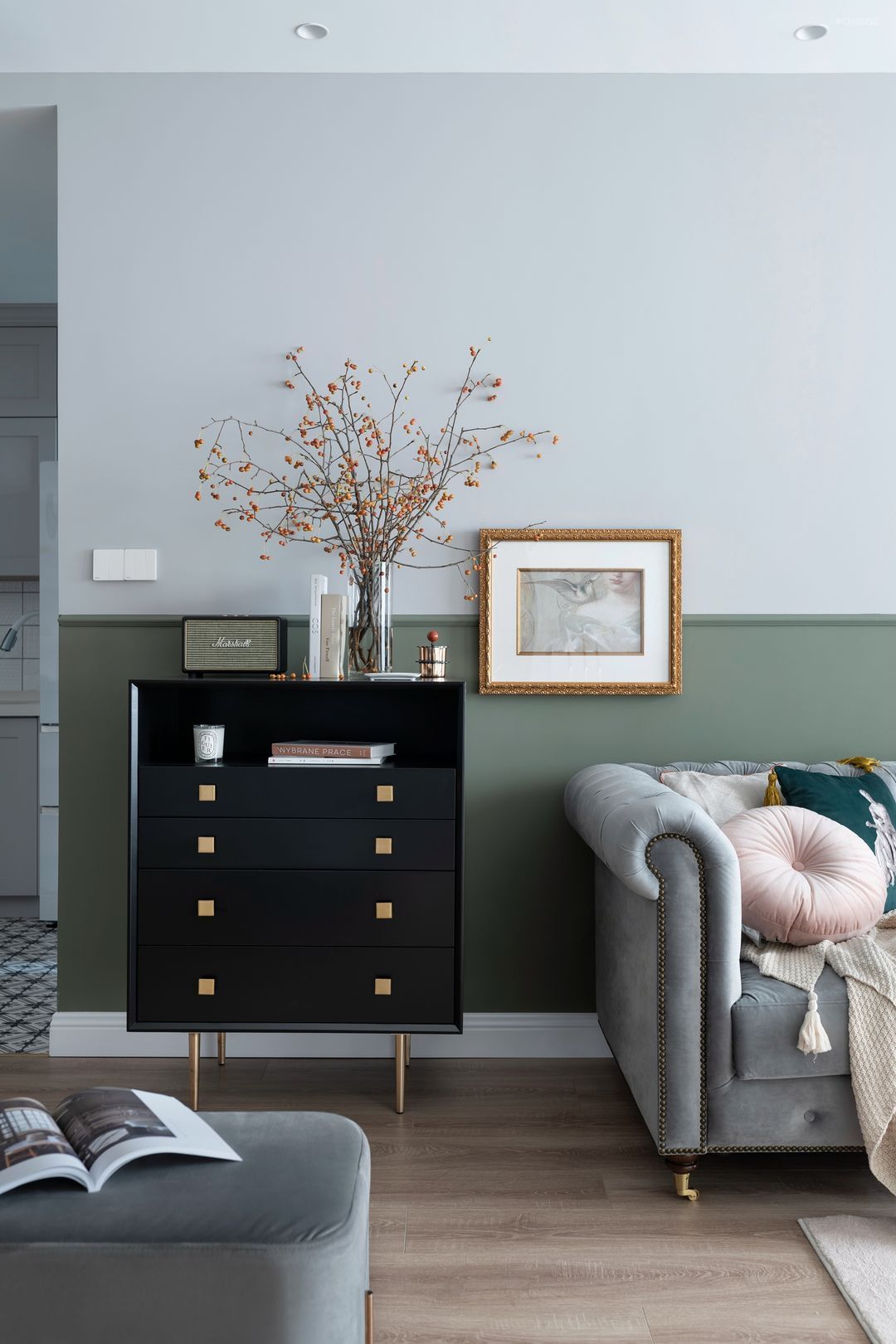 客厅区域的色彩充分展现出了业主的喜好,豆蔻绿色的墙纸,复古绿半墙,橄榄绿沙发,以及绿植的青葱翠绿,中和其它墙面和家具的无彩色,形成百看不厌的色彩关系。