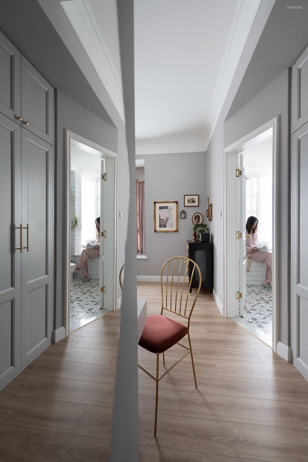 结合业主对风格、色彩的喜好,以及为了满足家庭未来五至十年的使用需求,我们将原始户型进行了改造。在满足美观的同时,我们为这个套三双卫的户型安置了约35㎡(投影面积)的储物空间,占房屋总面积的30%。