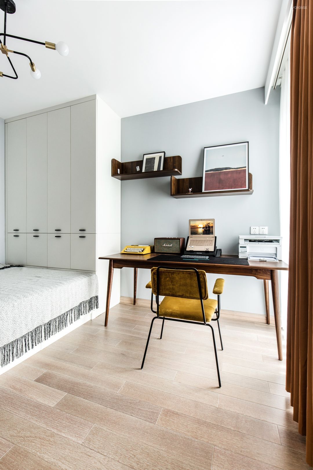 为了留出空间做办公区,次卧床采用了榻榻米,下方留出了空间用于储物。外侧可设计成抽屉,放置一些日常储物,而内侧则设计翻板,放置不常用的被褥和换季衣物等;