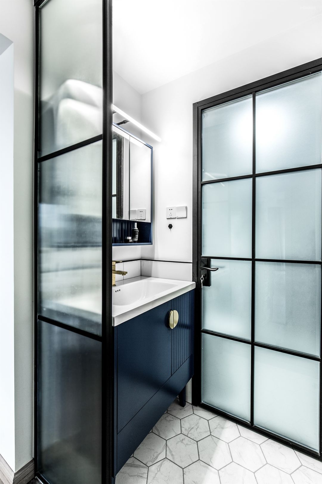 透光不透明的长虹玻璃门保障了通透性,卫生间内部马桶与淋浴区以防水门帘隔开,早高峰的时候,洗漱、如厕、淋浴可以同时进行。