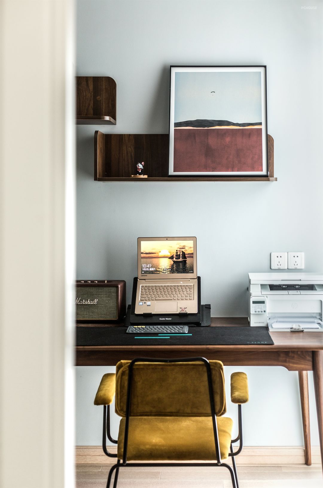 书桌和搁板继续沿用黑胡桃木材质,营造沉稳安静的阅读氛围。搁板上可以收纳书籍和文具,伸手就能够到,方便取放。