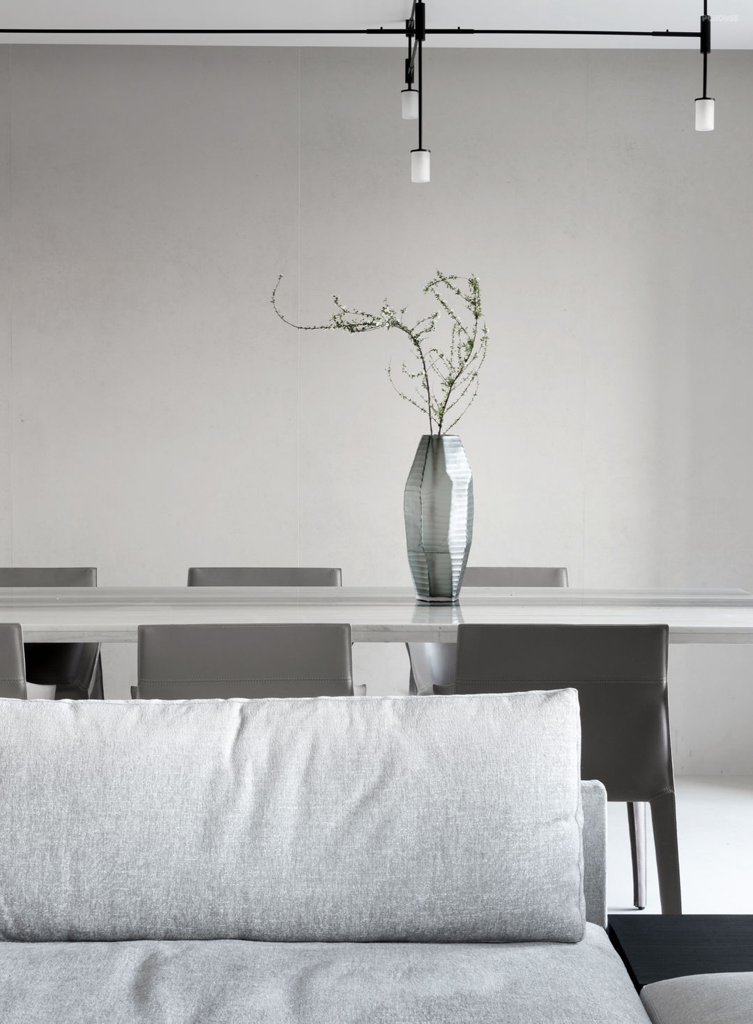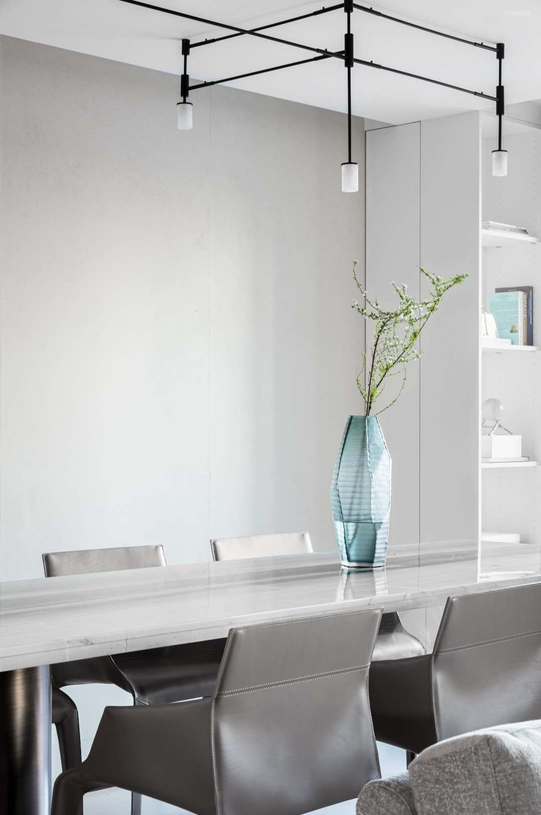 设计团队对于自然属性材料的选择也是不遗余力的。最初,设计师Ryan王恒为了找到一款最接近自然光状态的墙面材料而大费周章,反复比较尝试。他希望在大的基调下,墙面光线的反射能够呈现出一种最自然的状态,而不会引起使用者眼部不适。幸得业主支持,设计师最终选择了一款最接近自然光反射的岩板作为墙面材料,舒适的空间由此诞生。