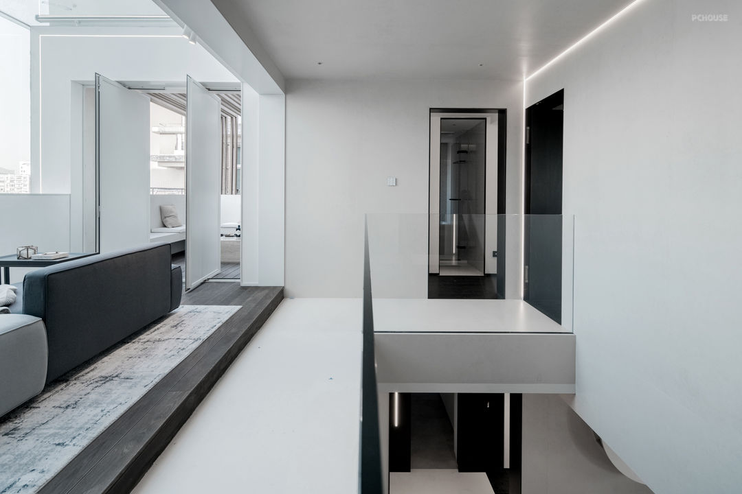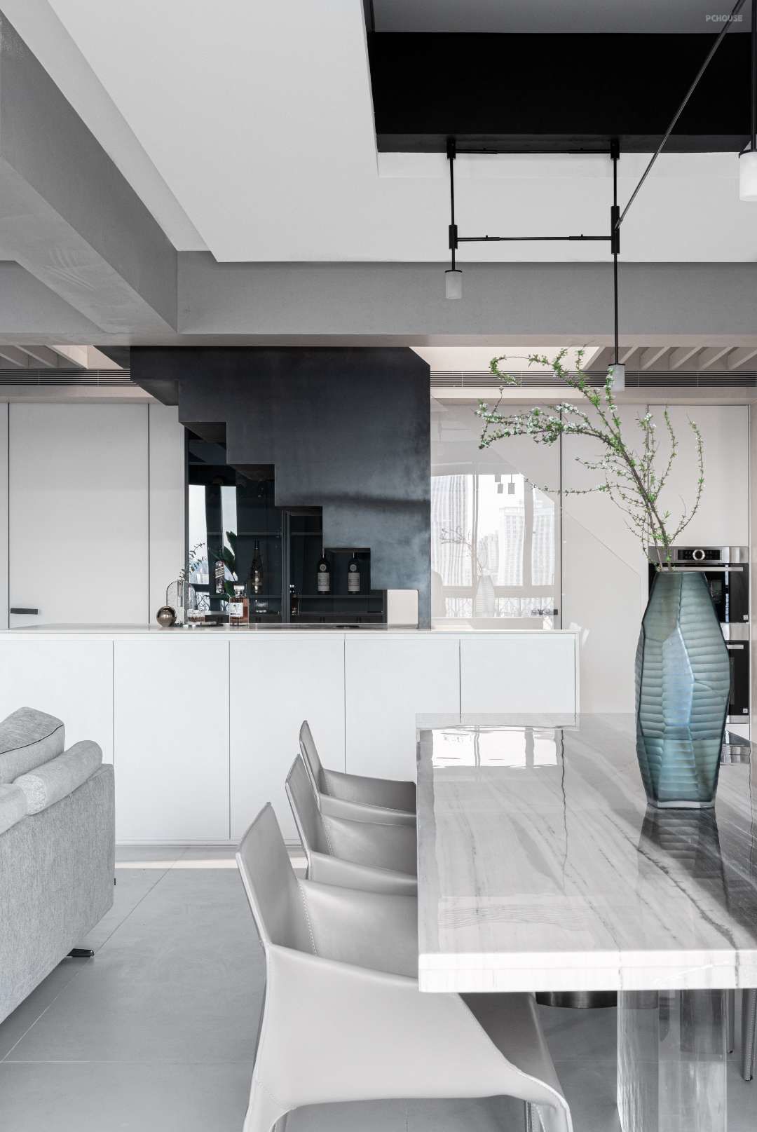 当极简的客厅与开放式厨房、楼梯彼此交融,呈现出了当下人群开放的生活心态。一家人对同一空间的最高诉求是什么?是功能性还有多元化,既满足他们的各种需求,又照顾他们的彼此不同。