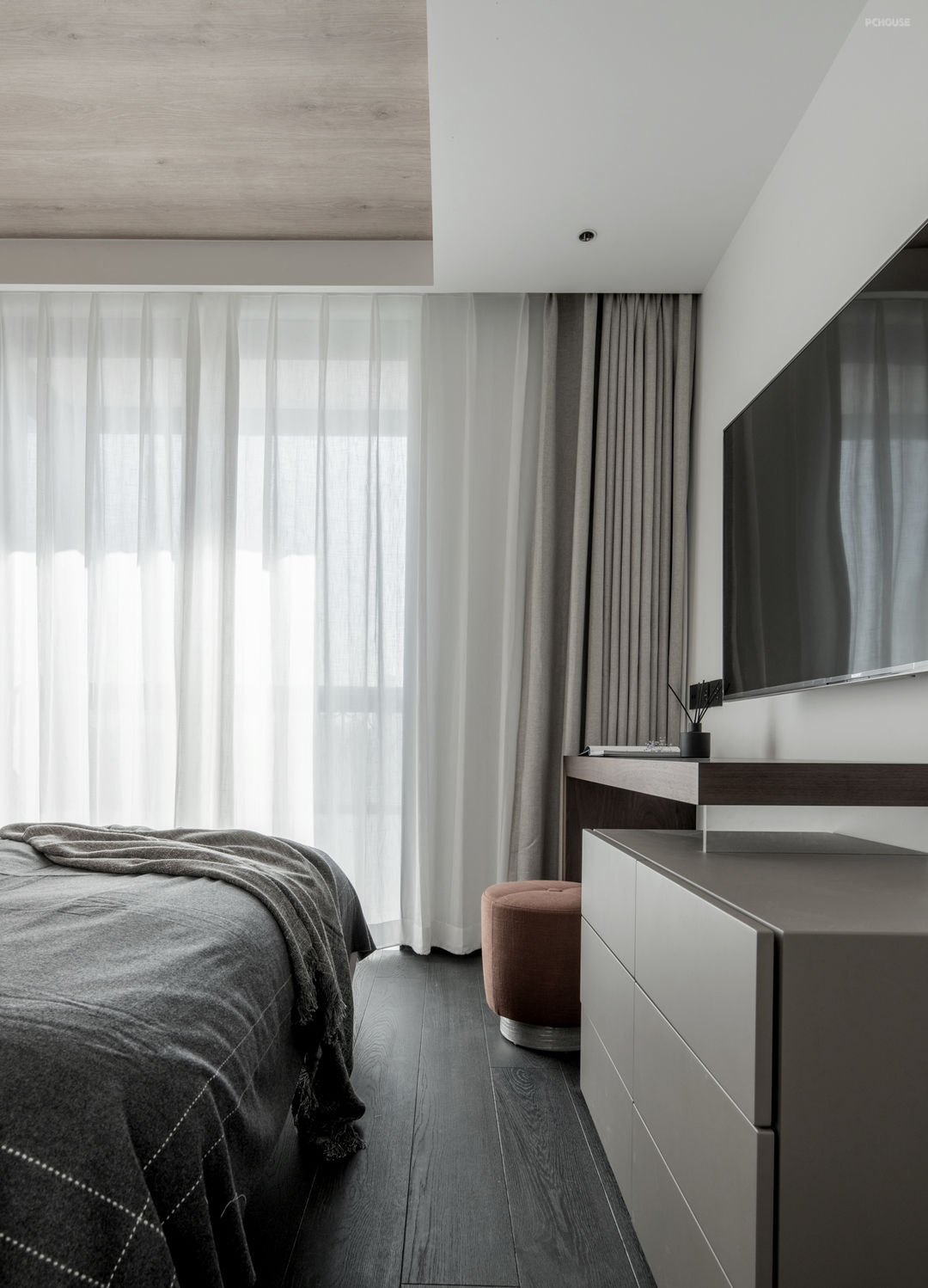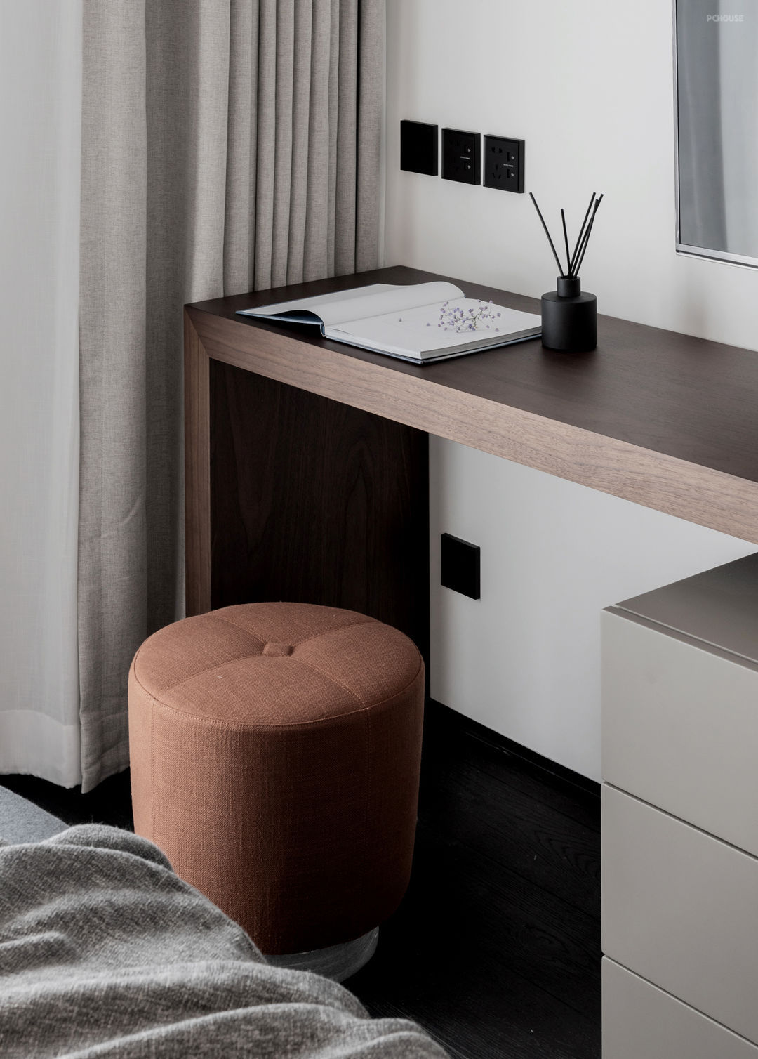 作为贯通两层空间的楼梯,设计师Ryan王恒在打造时也花了些心思。他缩减了二楼两间卧室的床下空间,用以抬升一楼楼梯两侧的区域,这样的设计是在不影响二楼正常使用的前提下,让光更具延展性,从而拉长客厅的视线,也使业主一家感觉更为舒适。