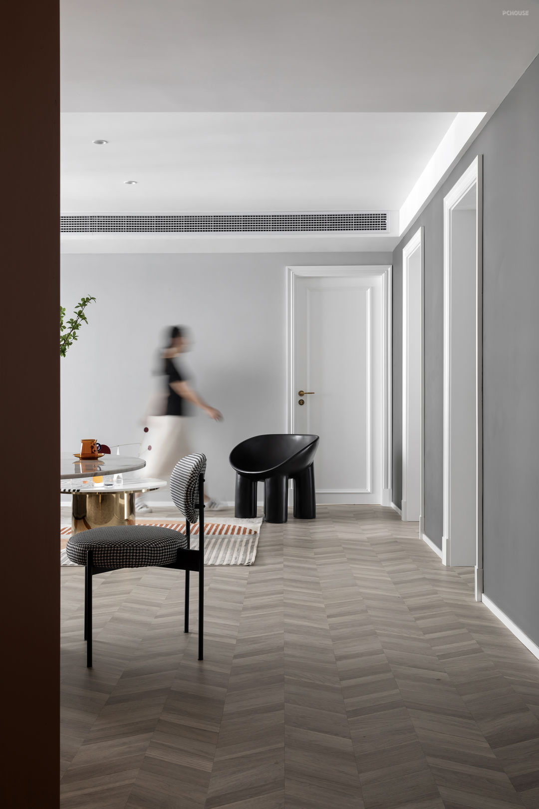 公共空间用地板营造温润的空间感,Roly-Poly Chair与白色房门让空间多了分惬意,搭配灰色Asiades沙发营造出活泼慵懒氛围。
