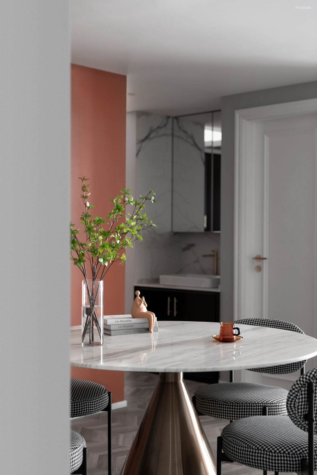 大理石餐桌为餐厅增加了品质感,表面的镀膜和防污处理为女主人的日常打理提供了便利。