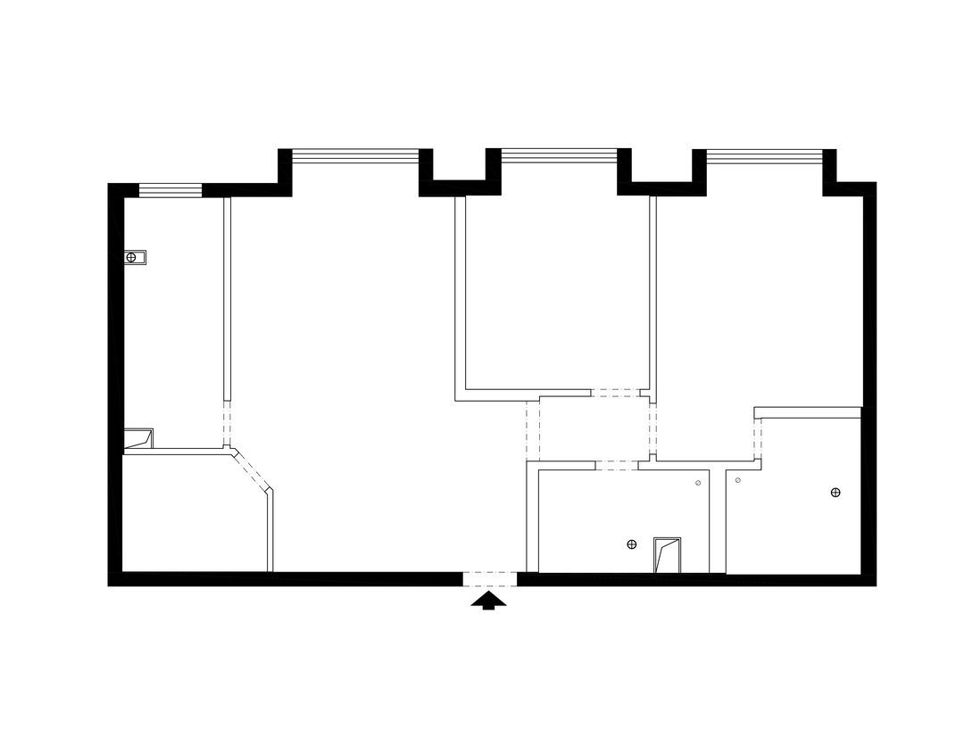 原始的户型采光优秀,大格局工整,但是左下角隔出的一小间既无采光又破坏了客厅的整体性,两个卧室和两个卫生间通过一个甬道连接,卧室与卫生间的门口相对,浪费了大量空间