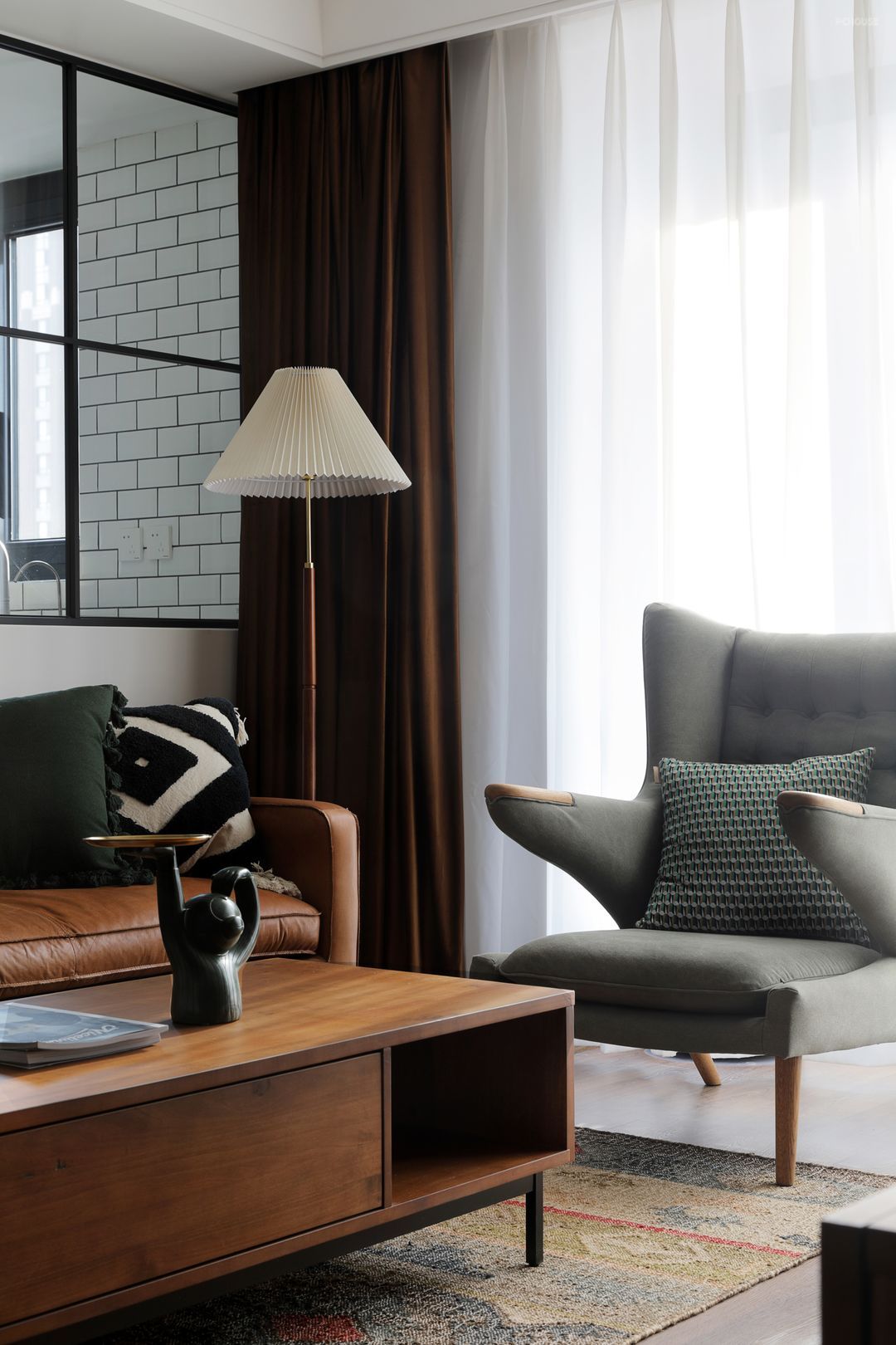 棕色的皮革沙发充满质感的折纸落地灯像一位老上海的绝世名伶坐在旁边;几何纹理的抱枕与猴子托盘增添了几分俏皮;赭石色天鹅绒窗帘搭配柔光纱帘,阳关轻轻洒进来。“这样的午后,就想坐在这沙发上美美的喝个下午茶。”