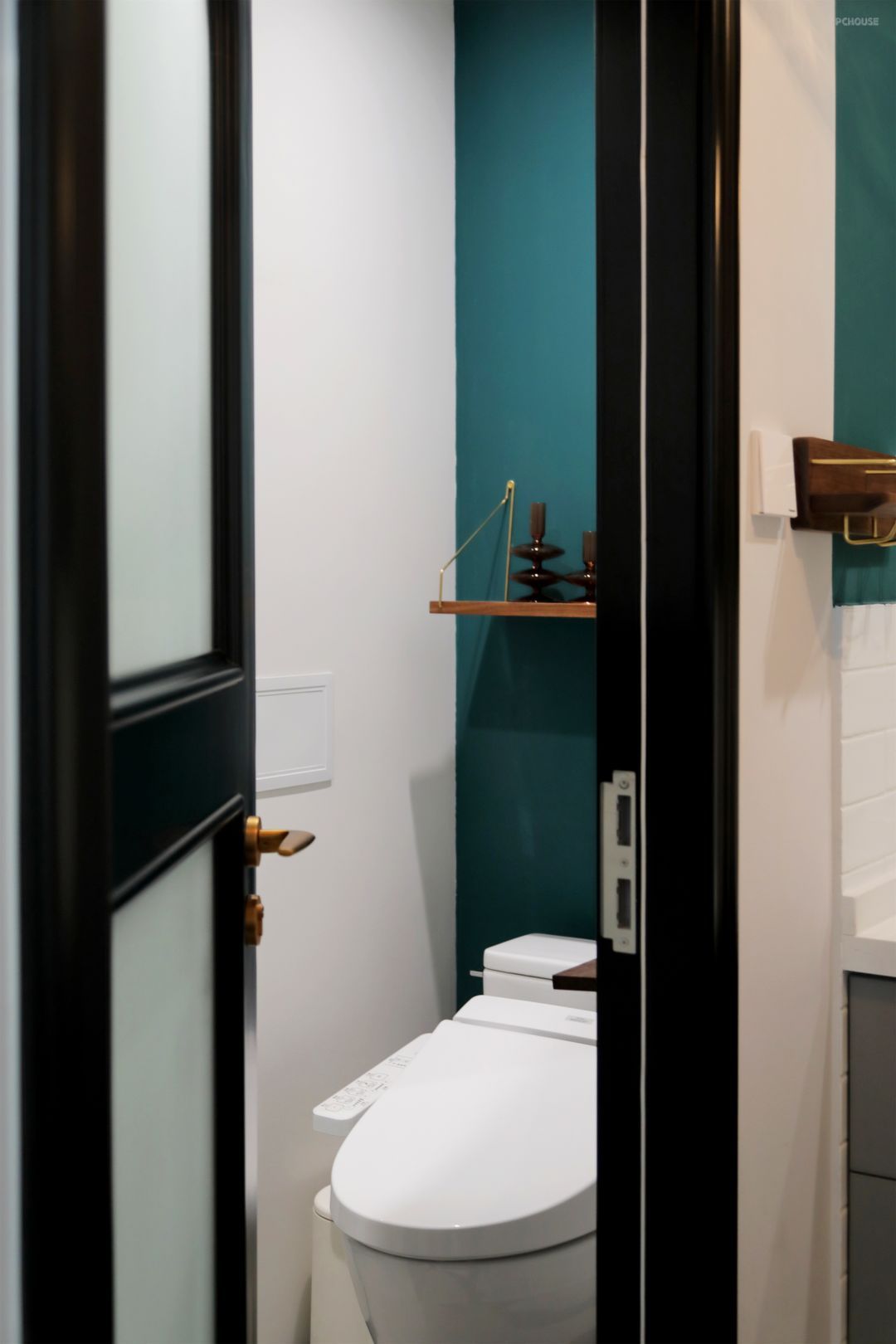 马桶后方大胆采用了防水乳胶漆落地,给卫生间增加一些活泼的可能。