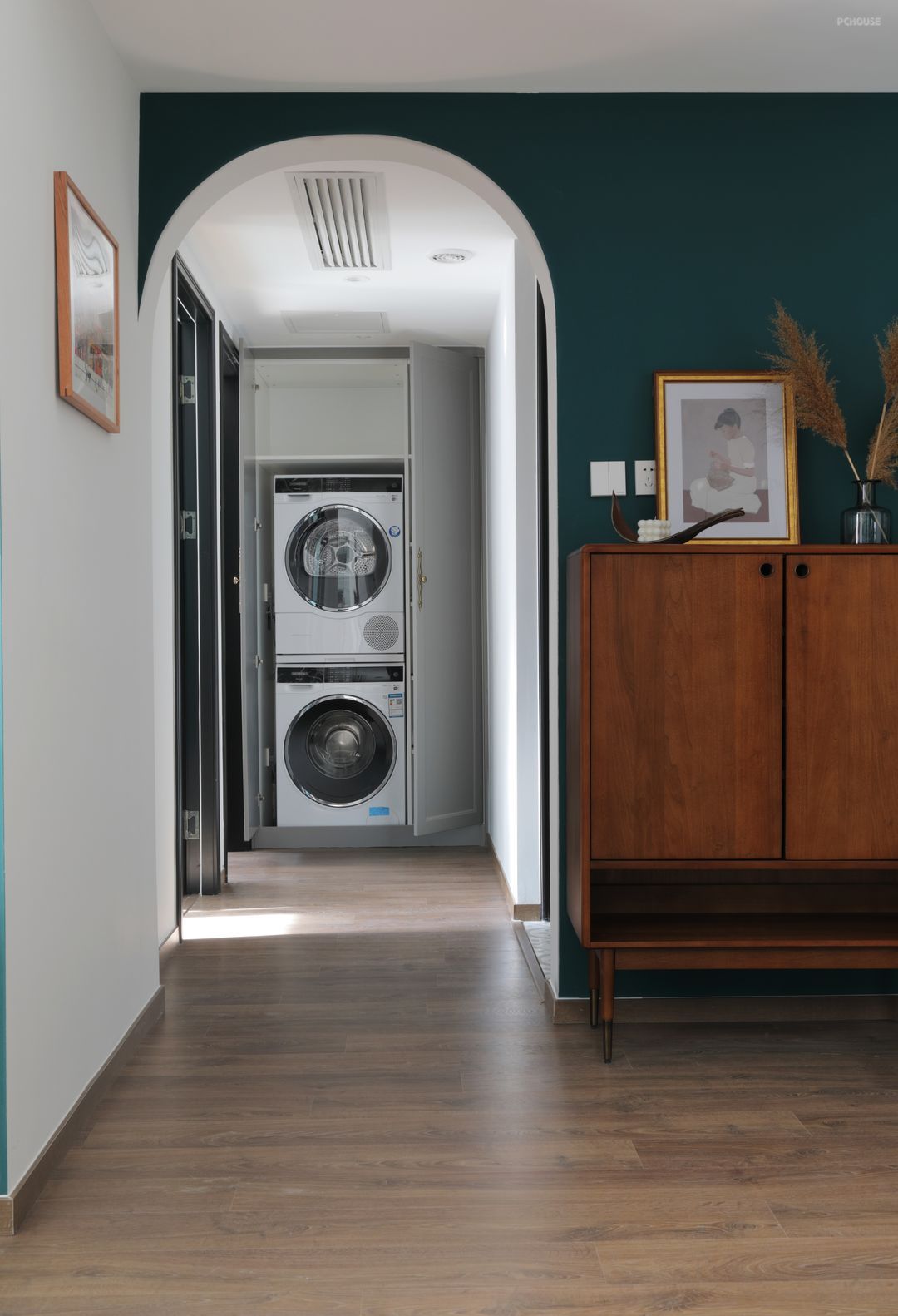 为了延续复古的风格,设计师并没有设计过多的嵌入式柜体,而是通过单个柜子的错落摆放实现了收纳的要求。
