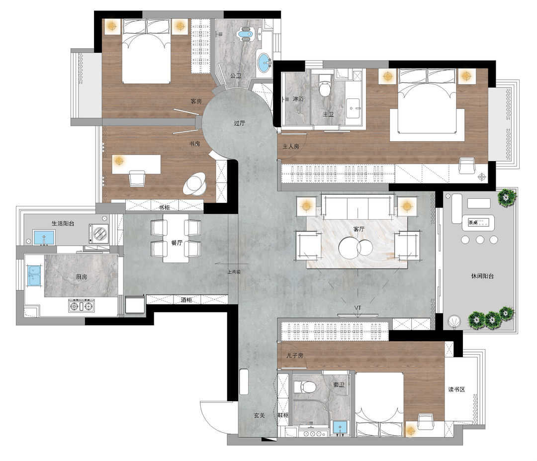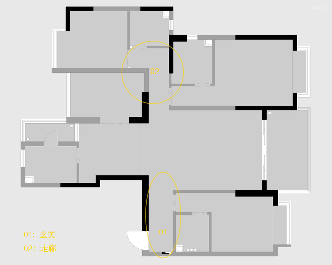 户型优化: 1,玄关后退与墙体拉平设置鞋柜区,运用鞋柜的木皮设计一体墙体将房间门影藏其中。 2,合理布局的圆形走廊过厅区域,各房间门依次展开,让走廊美观好用。 3,儿子房衣柜重新设计布局,动线更加合理,收纳更整体。 4,主卧室卫生间重新调整方向,满足大衣柜收纳需求。 #户型改造