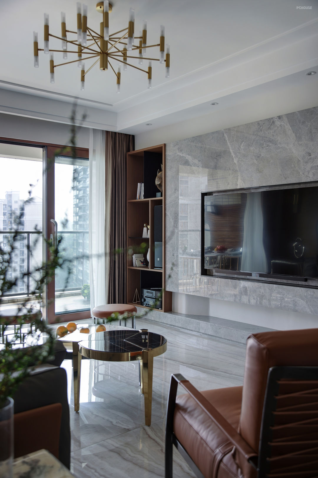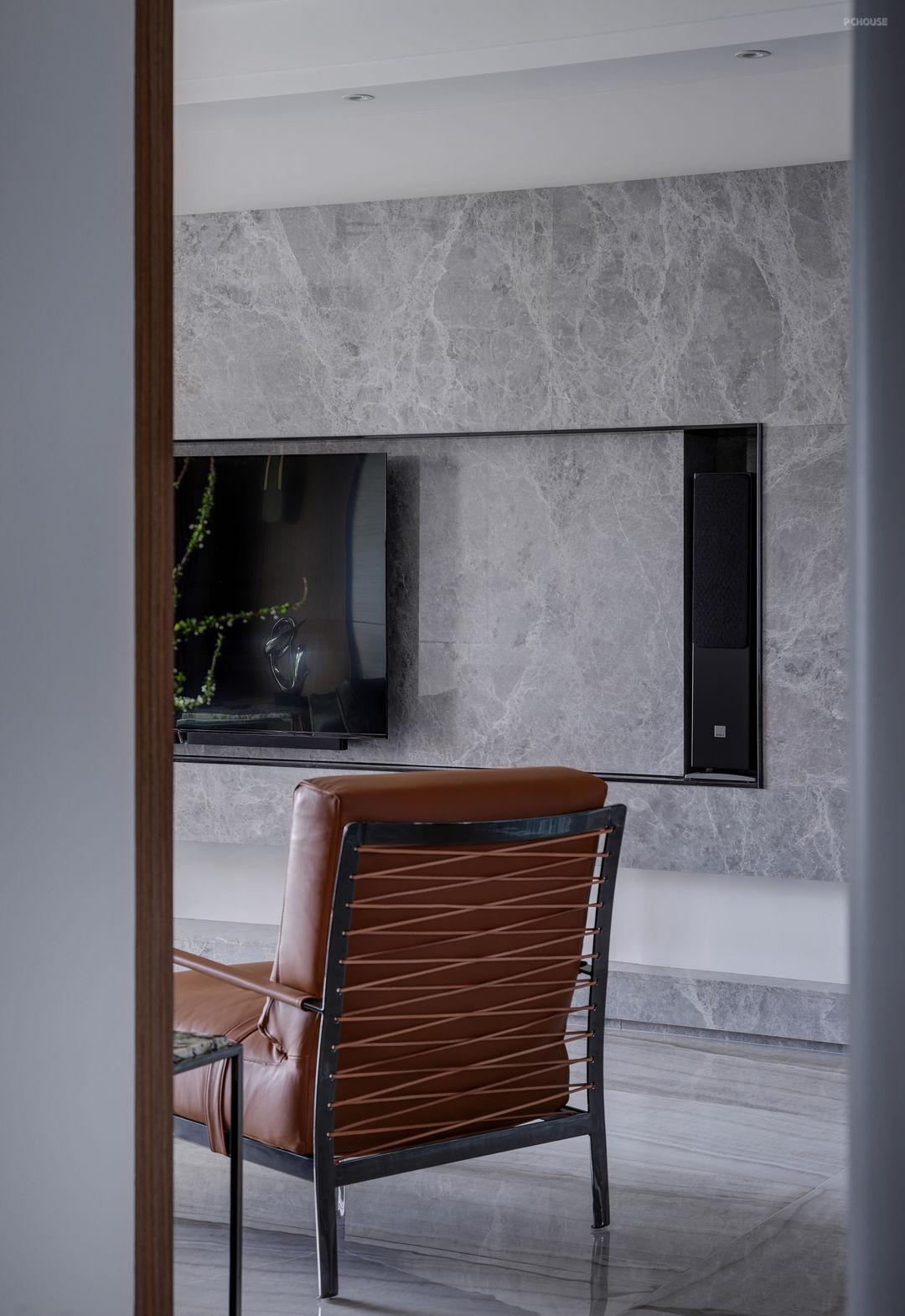 大块面灰调石材设计的电视区域是提升整个空间档次的一大法宝