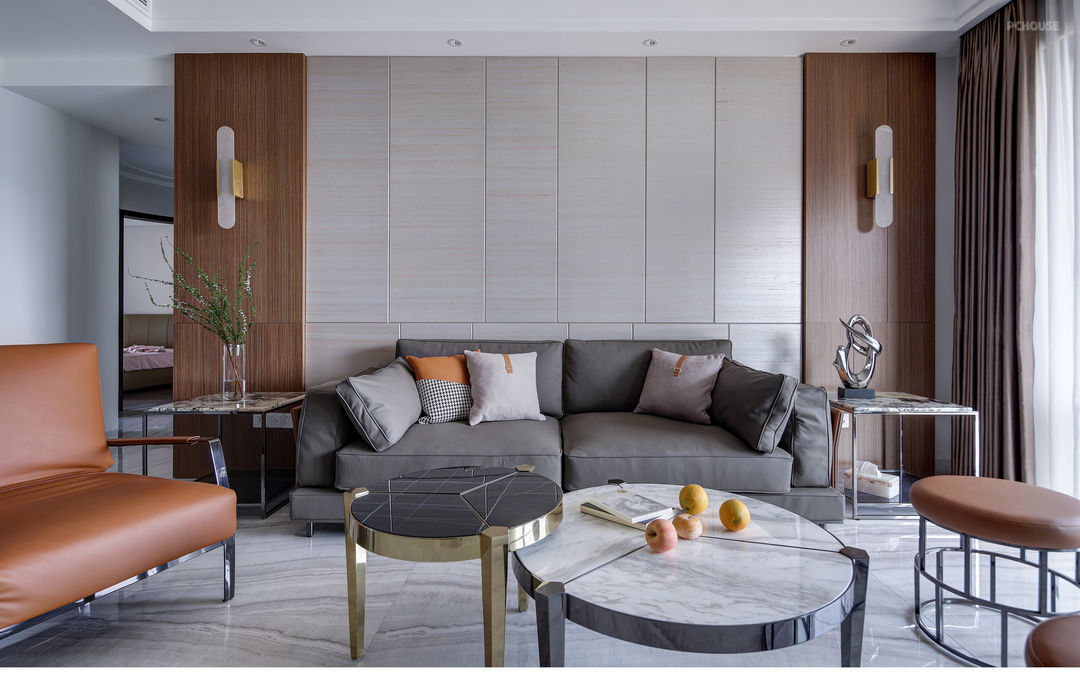 沙发背景运用木皮与灰调硬包的线条比例切割,通过线与面的布局设计体现空间的整体感