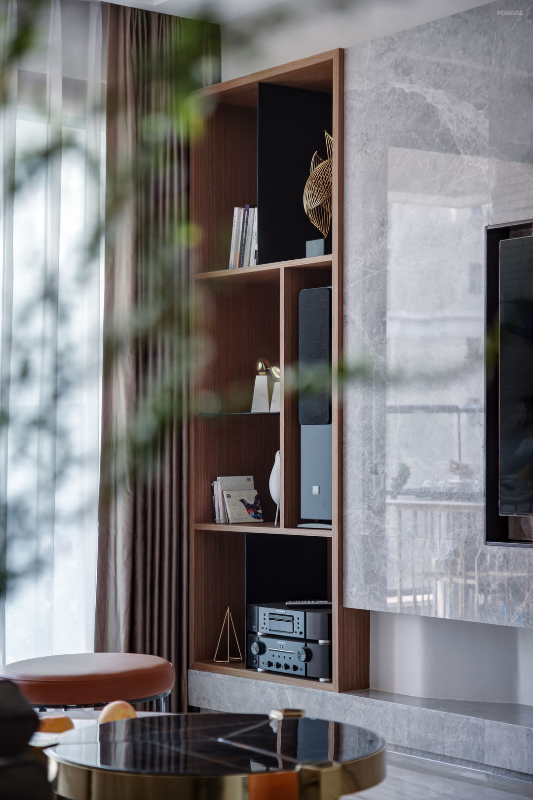 为了扩大客厅的空间感,客厅不设置电视柜,而是在电视背景侧面设置了收纳柜,提前设计影藏各个电器与电视的连接线路,好看且实用。收纳柜以木皮与黑色铁件层板材质碰撞,细节呼应整体的设计