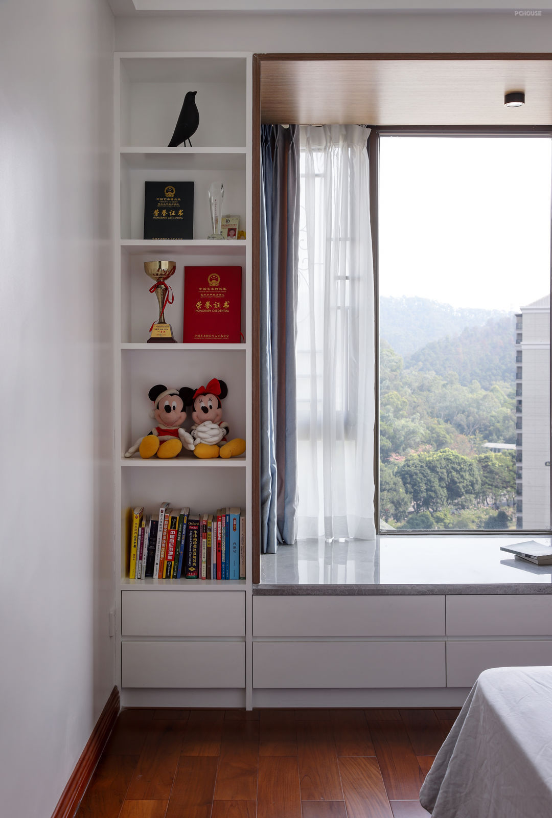 儿子房学习区,整体设计的学习区读书角很好的利用了原本不好用的窗台,形成书柜与榻榻米式的阅读角。可以看书,可以跟同学下棋,可以有很多情景模式,而室外就是东莞旗峰山美景