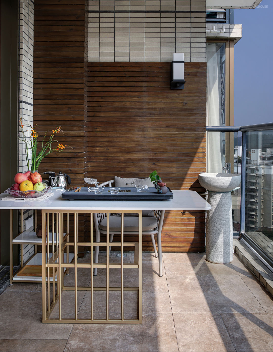 阳台背景用防腐木切割成5公分拼贴,韵律感很强;茶区设计功能一点不落,取茶/煮水/泡茶/冲洗---好看且实用