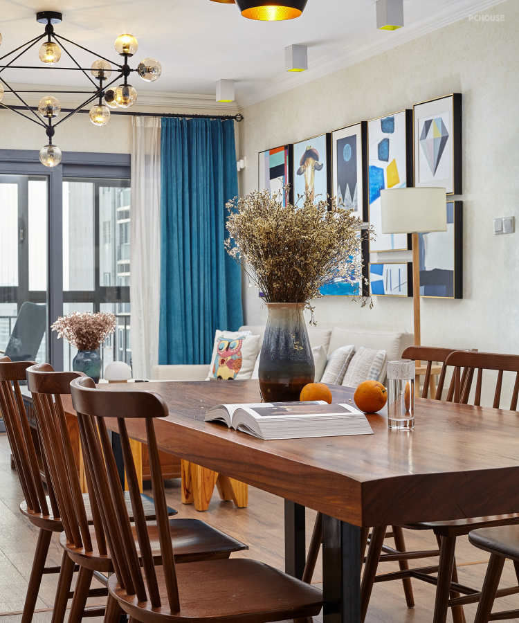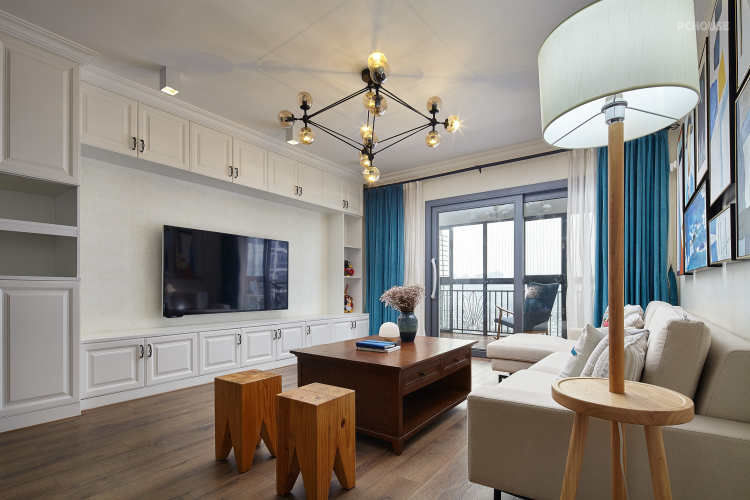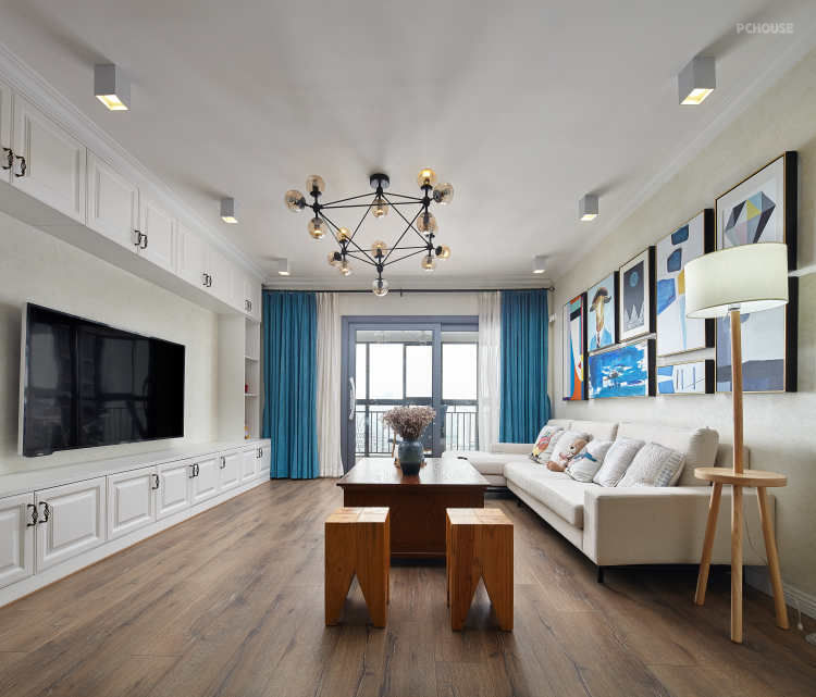 基本都是以白色调来作为空间的主色调,在软装我们搭配了蓝色来点缀空间,墙面的油画组合挂画是女主人的最爱。家里储物空间要够是初见两人提得最多的关键词,在做的过程中我们把柜体与造型结合在了一起,包括现在居住也反馈,家里确实很容易收拾且不会显凌乱。