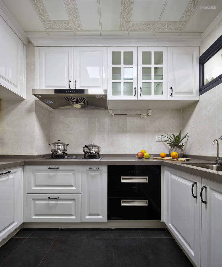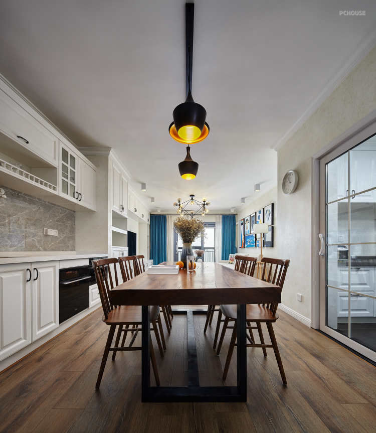 餐厅与厨房之间采用可视推拉门,保证视觉空间的通透性。左侧的水吧台起了很大的作用,与右侧的厨房同时服务于餐厅空间,洗水果或者家人客人来时泡茶等都在水吧台解决了。