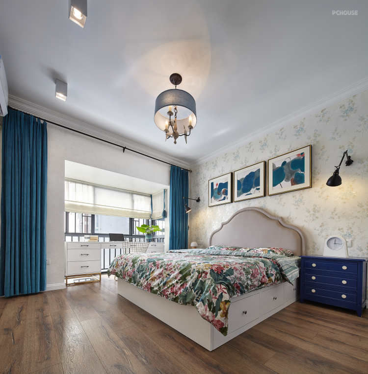 ……主卧……主卧室,一面墙的衣柜储物收纳,卧室的蓝与客厅做到延伸,素雅中带着个性。